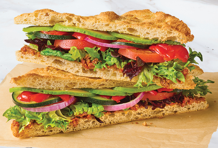 Vegan Catalan Sandwich-Roma tomatoes, sliced cucumber, fresh avocado, peppadew peppers, red onions, lettuce, romesco sauce, on Roma Italian flat bread. Contains nuts. Served with bagged chips, and choice of dessert.